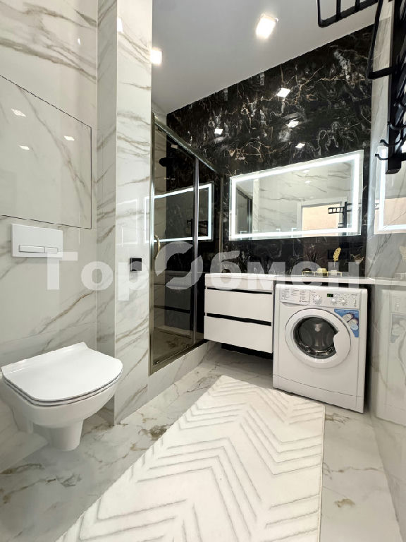 Совмещенный санузел, отделанный керамогранитом, с теплым полом;